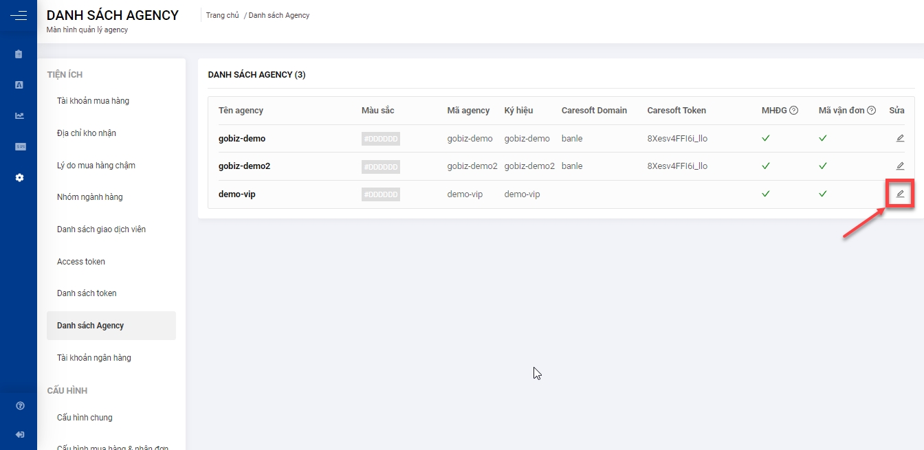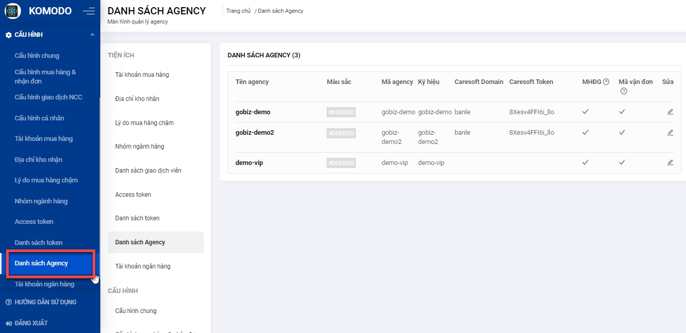 Bước 1: Quản lý truy cập trang Cấu hình từ menu bên trái, chọn Danh sách Agency