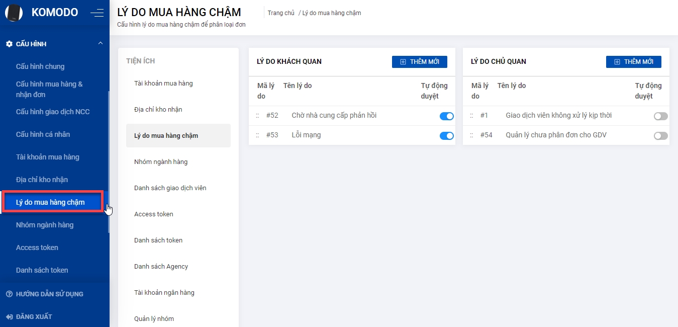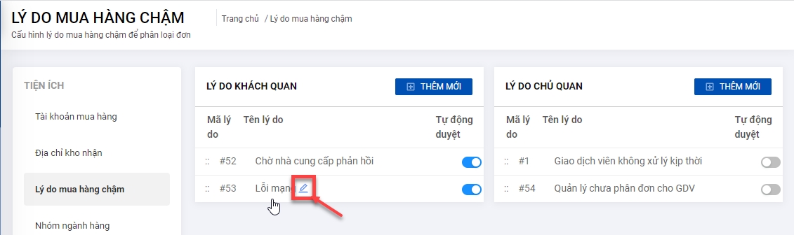 Mục đích: Quản lý danh sách lý do mua hàng chậm, hỗ trợ khai báo các lý do mua chậm chủ quan và khách quan, chỉnh sửa lý do đã có.