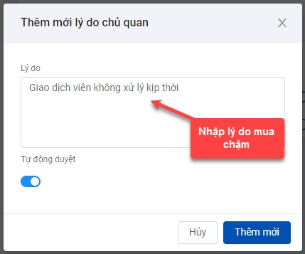 Bước 2: Quản lý tạo mới lý do mua chậm bằng cách chọn chức năng Thêm mới, sau đó nhập lý do và click Thêm mới để hoàn thành khai báo lý do mua hàng chậm.