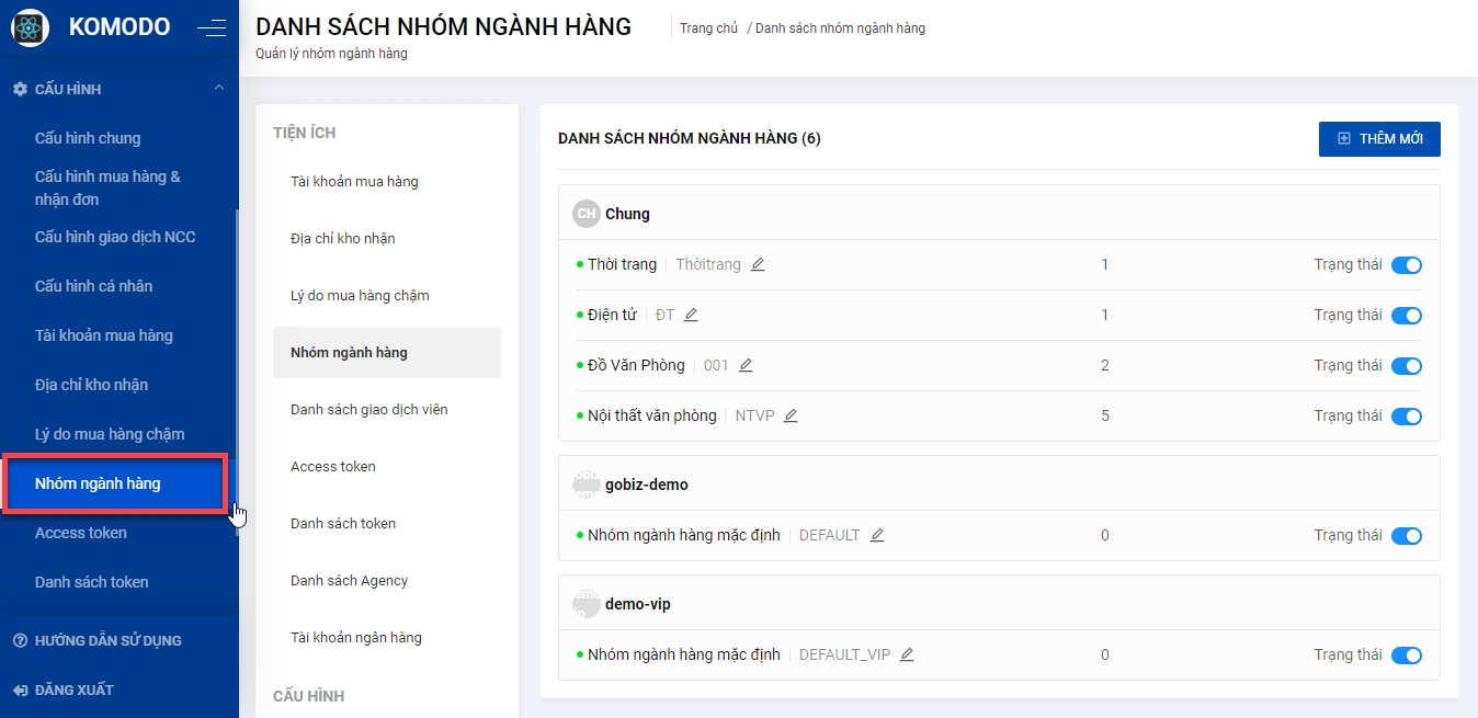 Bước 1: Quản lý truy cập trang Cấu hình từ menu bên trái, chọn Nhóm ngành hàng