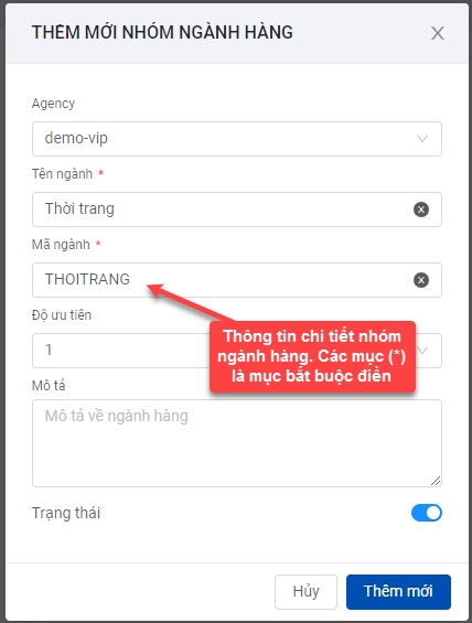 Bước 2: Quản lý tạo nhóm ngành hàng bằng cách chọn chức năng Thêm mới, sau đó nhập thông ngành hàng như: Agency,Tên ngành, Mã ngành,Trạng thái,... và click Thêm mới để hoàn thành khai báo thông tin ngành.