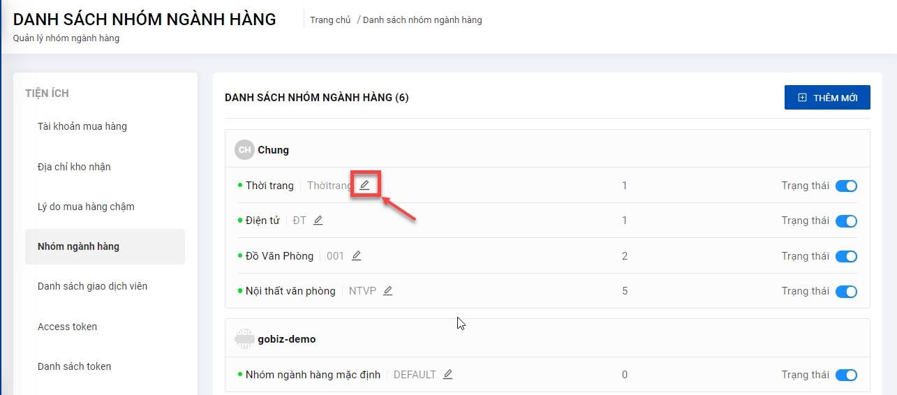 Mục đích: Quản lý danh sách nhóm ngành hàng và hỗ trợ khai báo ngành hàng trên hệ thống, chỉnh sửa thông tin ngành hàng đã có.