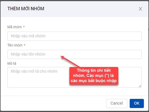 Bước 2: Quản lý tạo nhóm bằng cách chọn chức năng Thêm mới, sau đó nhập thông tin nhóm như: Mã nhóm, tên nhóm, mô tả và click OK để hoàn thành khai báo thông tin nhóm.