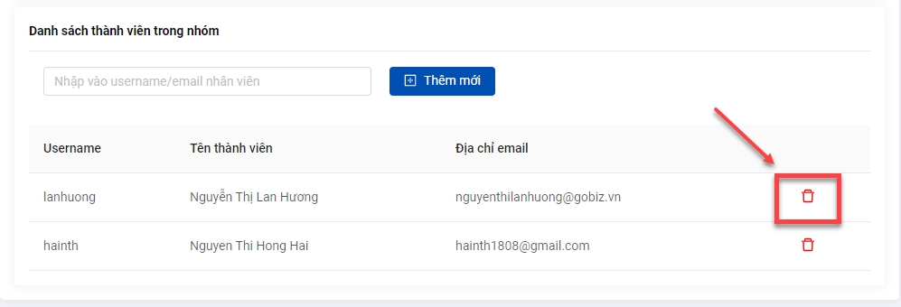 Để xóa nhân viên khỏi nhóm, Quản lý click vào icon