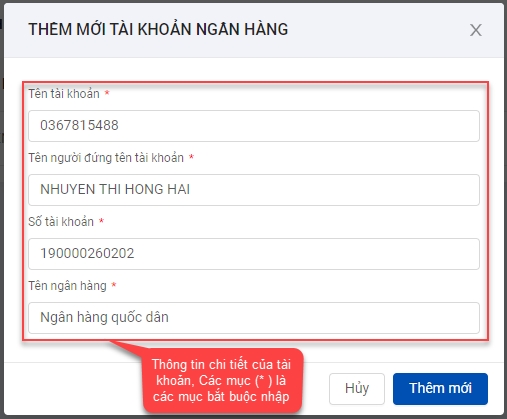 Bước 2: Quản lý tạo tài khoản mới bằng cách chọn chức năng Tạo mới, sau đó nhập thông tin tài khoản như: Tên tài khoản, Tên người đứng tên tài khoản, Số tài khoản, Tên ngân hàng và click Thêm mới để hoàn thành khai báo thông tin tài khoản