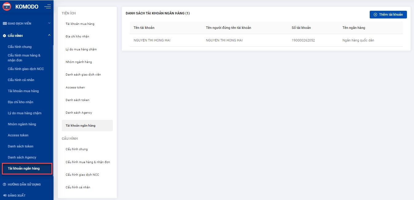 Mục đích: Quản lý danh sách tài khoản ngân hàng và hỗ trợ khai báo các tài khoản mới trên hệ thống.