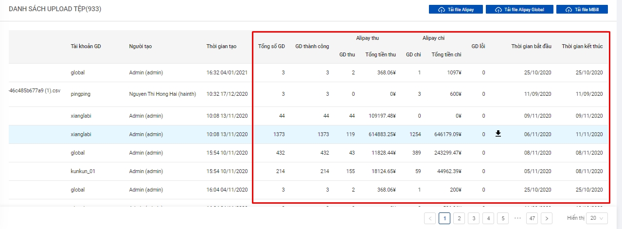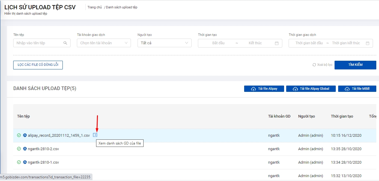 Bước 3: Sau khi upload file alipay thành công, giao dịch alipay sẽ tự động khớp với đơn hàng dựa trên mã hóa đơn gốc. Kế toán xem thông tin các giao dịch trong file upload bằng cách di chuột qua tên file và click chọn icon Xem danh sách file upload
