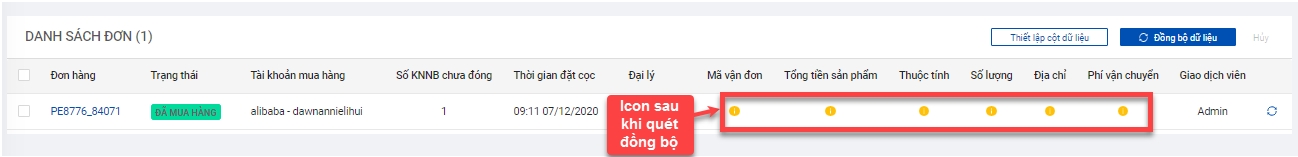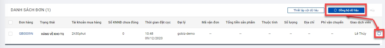 Bước 2: Click chọn đơn hàng và click icon đồng bộ để đồng bộ tất cả các đơn, hoặc click icon đồng bộ trên từng đơn