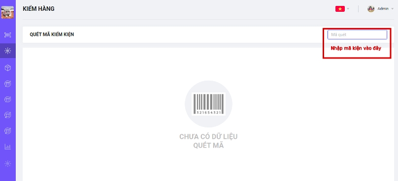 Bước 1: Truy cập vào Menu chọn kiểm hàng -> nhập/quét mã kiện tại ô Mã quét