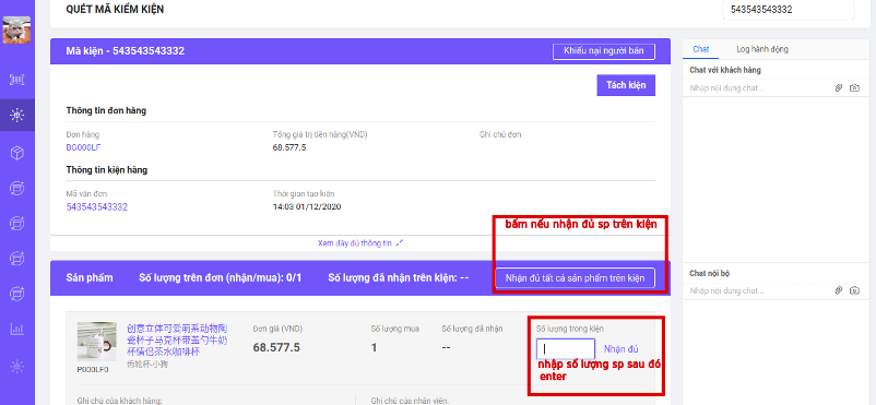 *Lưu ý: Có thể bấm vào nút nhận đủ trên từng kiện, hoặc nút nhận đủ tất cả sản phẩm trên kiện.
