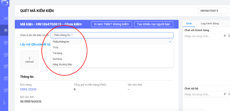 - Trường hợp kiện hàng có phát sinh trong quá trình kiểm cần chờ xử lý (ví dụ thông tin sản phẩm trên đơn hàng chưa kê khai, hàng không vận chuyển được cần trả…) -> bấm chọn lý do để đánh dấu kiện sai/lỗi như hình: