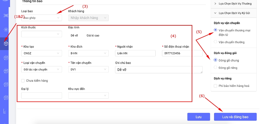 Bước 1: Vào Menu -> Bao hàng (1) -> Tạo bao hàng (2) -> Điền thông tin bao hàng (kích thước bao hàng, chọn kho, loại vận chuyển…(3,4,5) -> Lưu và đóng bao.