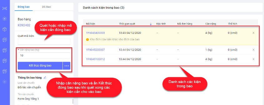 Bước 2: Quét kiện vào bao hàng: Tại ô quét mã kiện, Nhân viên điền mã hoặc quét mã kiện cần đóng vào bao hàng -> nhập cân nặng của bao và chọn "Kết thúc đóng bao" để hoàn tất.