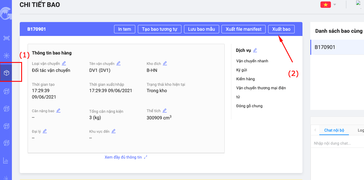 Bước 1: Vào menu -> Bao hàng -> Danh sách bao hàng (1) -> Xuất bao (2).