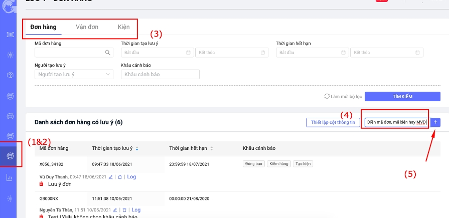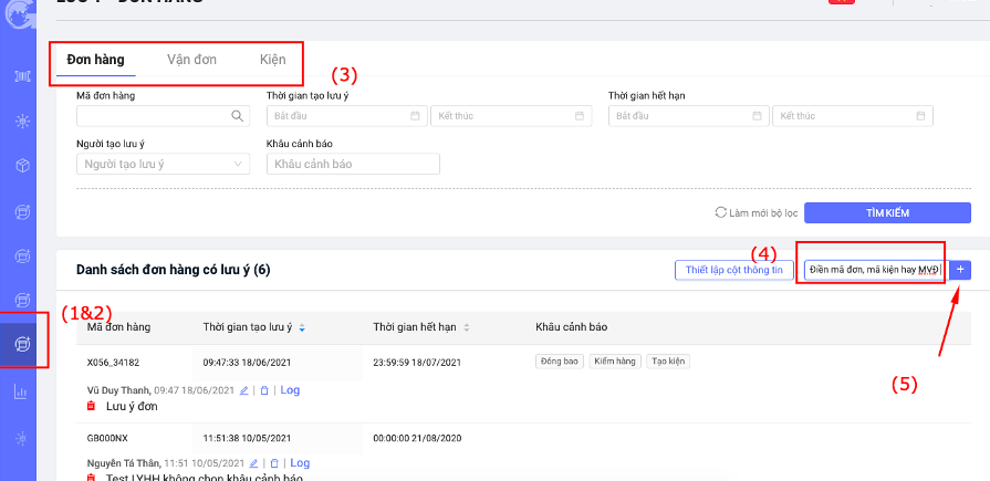 Bước 1: Vào Menu -> Lưu ý hàng hoá (1) -> DS lưu ý hàng hoá (2) -> Chọn tad lưu ý cho mã đơn/Kiện/Mã vận đơn (3) -> Điền mã đơn hoặc mã kiện hay MVĐ muốn tạo lưu ý (4) -> Click vào dấu (+) (5).