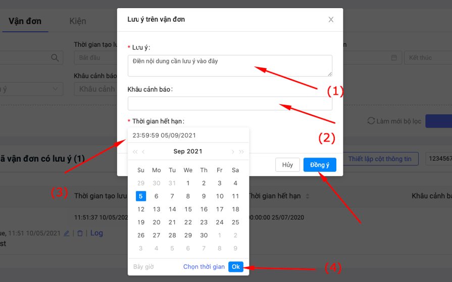Bước 2: Điền nội dung cần lưu ý (1) -> Chọn khâu cảnh báo (2) -> Chọn thời gian (3) -> Bấm ok (4) -> Đồng ý (5).