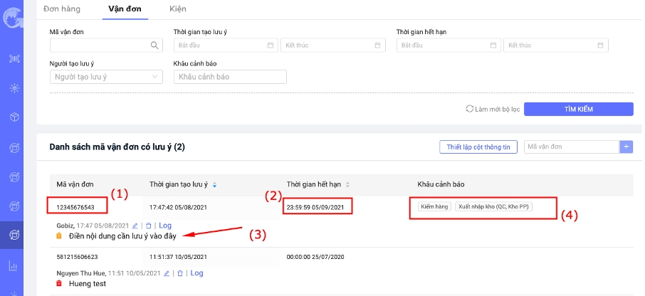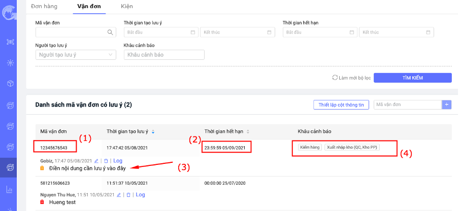 Tại danh sách lưu ý hàng hoá sẽ có đầy đủ các thông tin: Mã vận đơn, mã đơn hay mã kiện tương ứng vừa tạo (1); thời gian hết hạn lưu ý (2); Nội dung lưu ý đã tạo (3); Khâu cảnh báo (4).