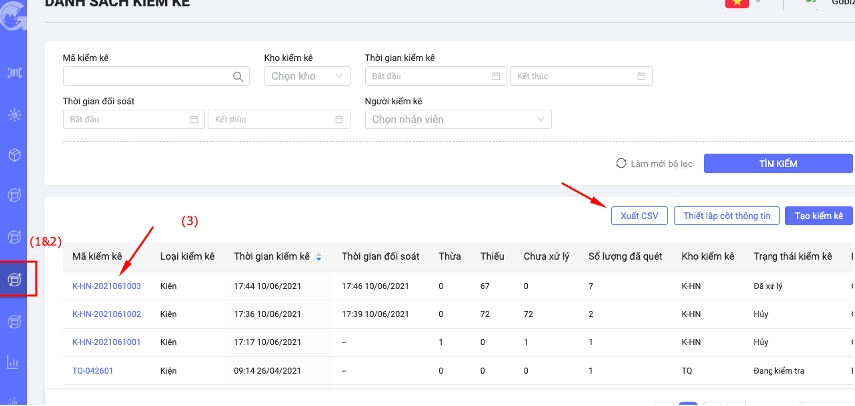 Vào menu -> Kiểm kê (1) -> Danh sách đã kiểm kê (2) -> Chọn mã kiểm kê muốn check (3) -> Xuất CSV (4).