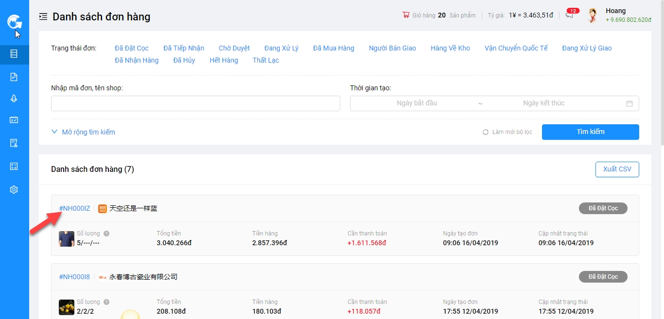 Tại danh sách đơn hàng Quý khách click vào Mã đơn hàng để đến Chi tiết đơn hàng.