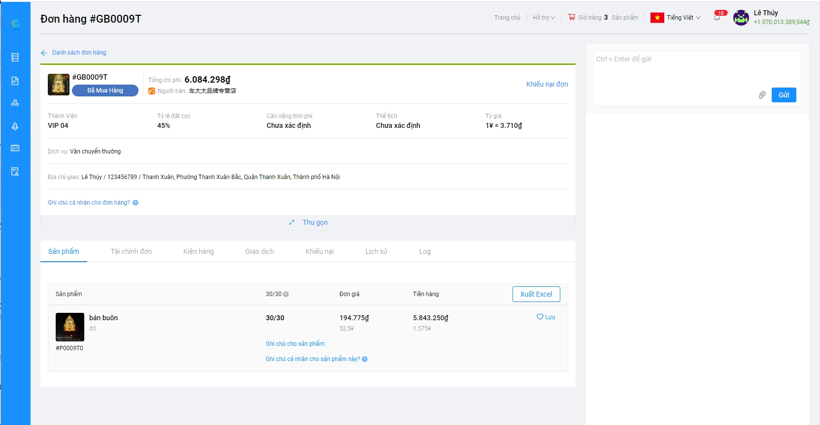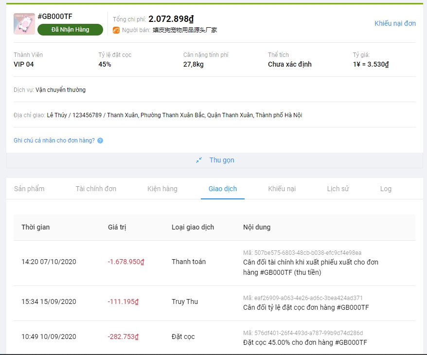 Các tab: Sản phẩm, tài chính đơn, kiện hàng, giao dịch, khiếu nại, lịch sử đơn và Log hoạt động trên đơn.