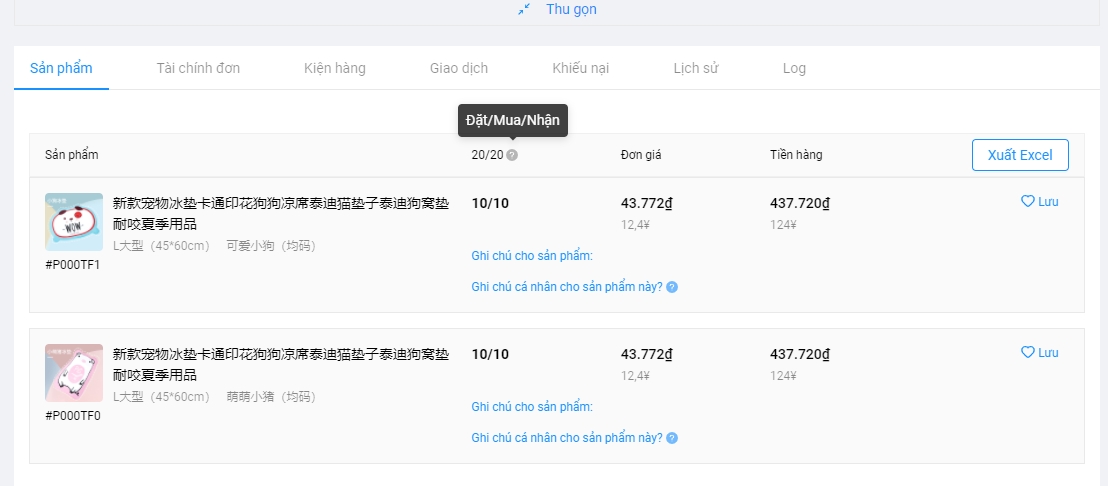 Số lượng sản phẩm: Đặt/Mua/Nhận.