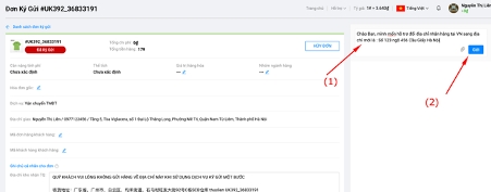 Từ chi tiết đơn hàng, Quý khách điền nội dung muốn hỗ trợ/trao đổi (1) -> Bấm gửi (2).