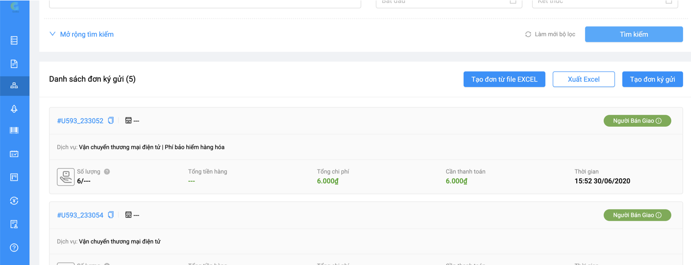 Áp dụng đối với các trường hợp ký gửi hàng hoá không cần tạo đơn hàng