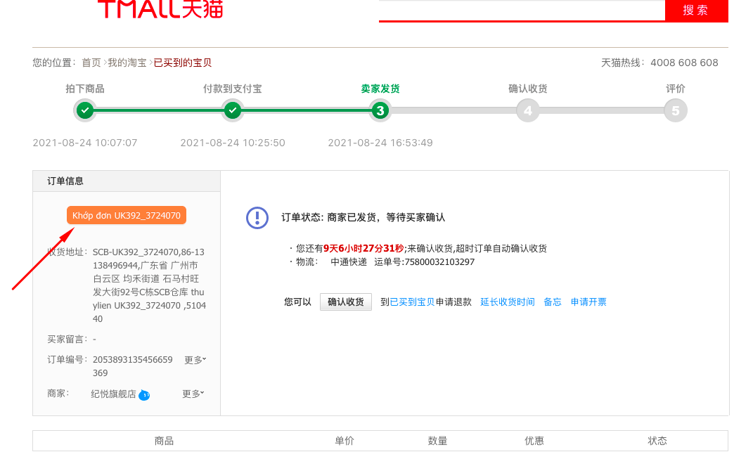 Đã khớp đơn: Kho Trung Quốc đã tạo đơn hàng tương ứng với MVĐ nhận được.