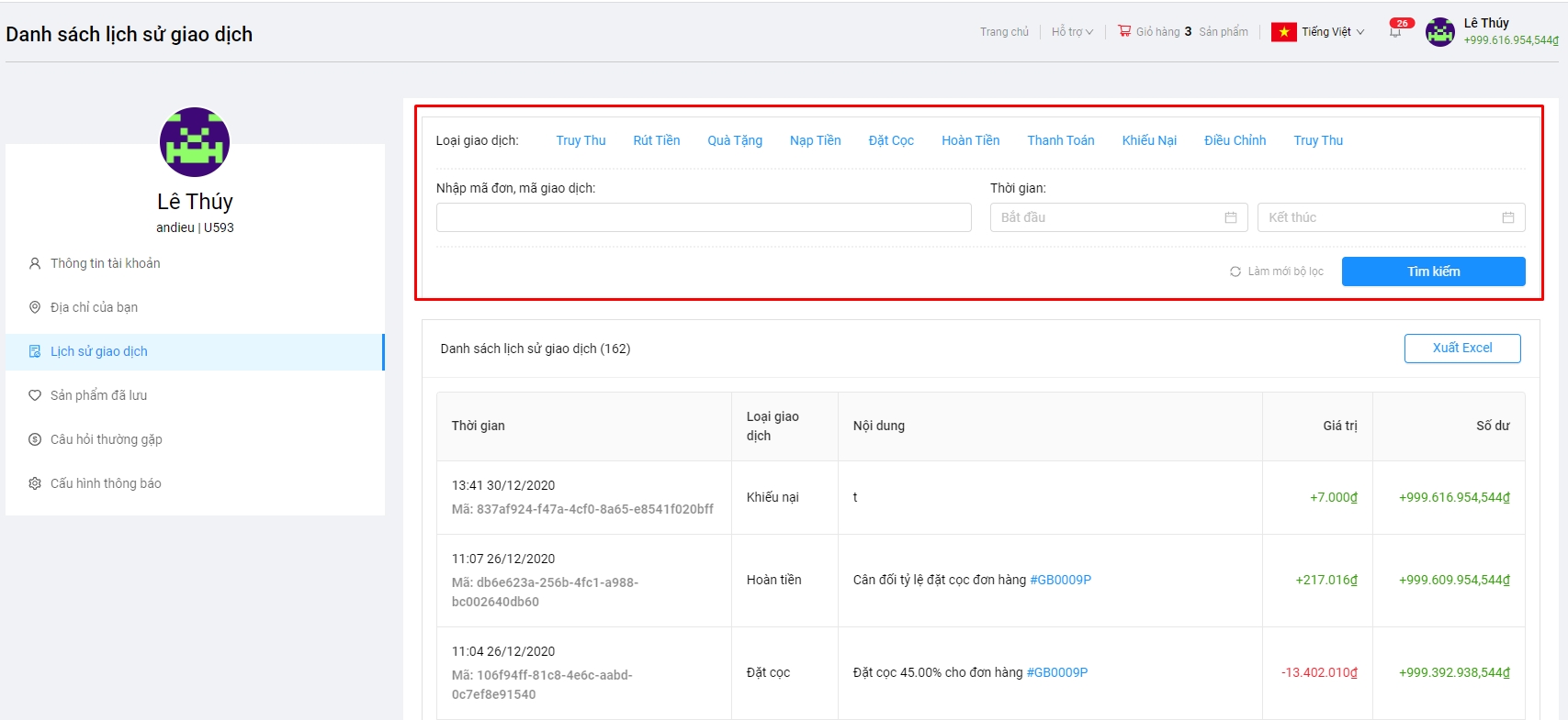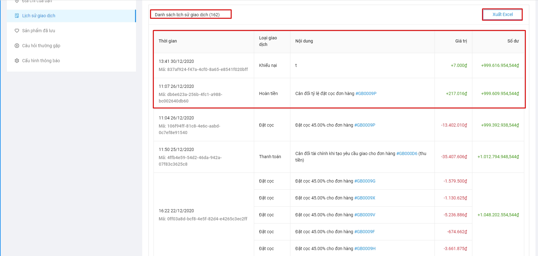 Xuất excel danh sách giao dịch.