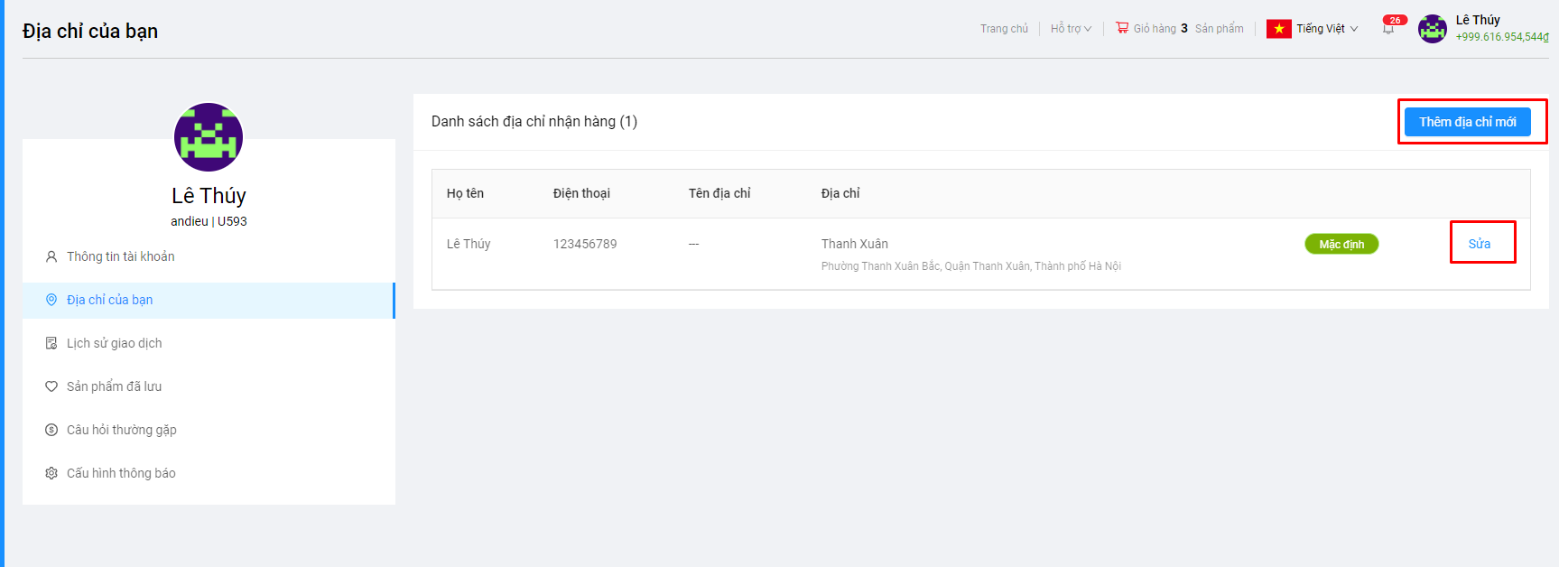 Đối với địa chỉ đã đặt làm mặc định sẽ không thể xóa, chỉ có thể chỉnh sửa thông tin.