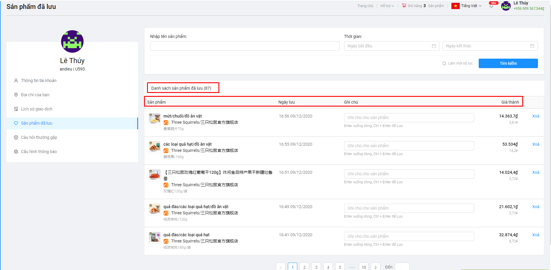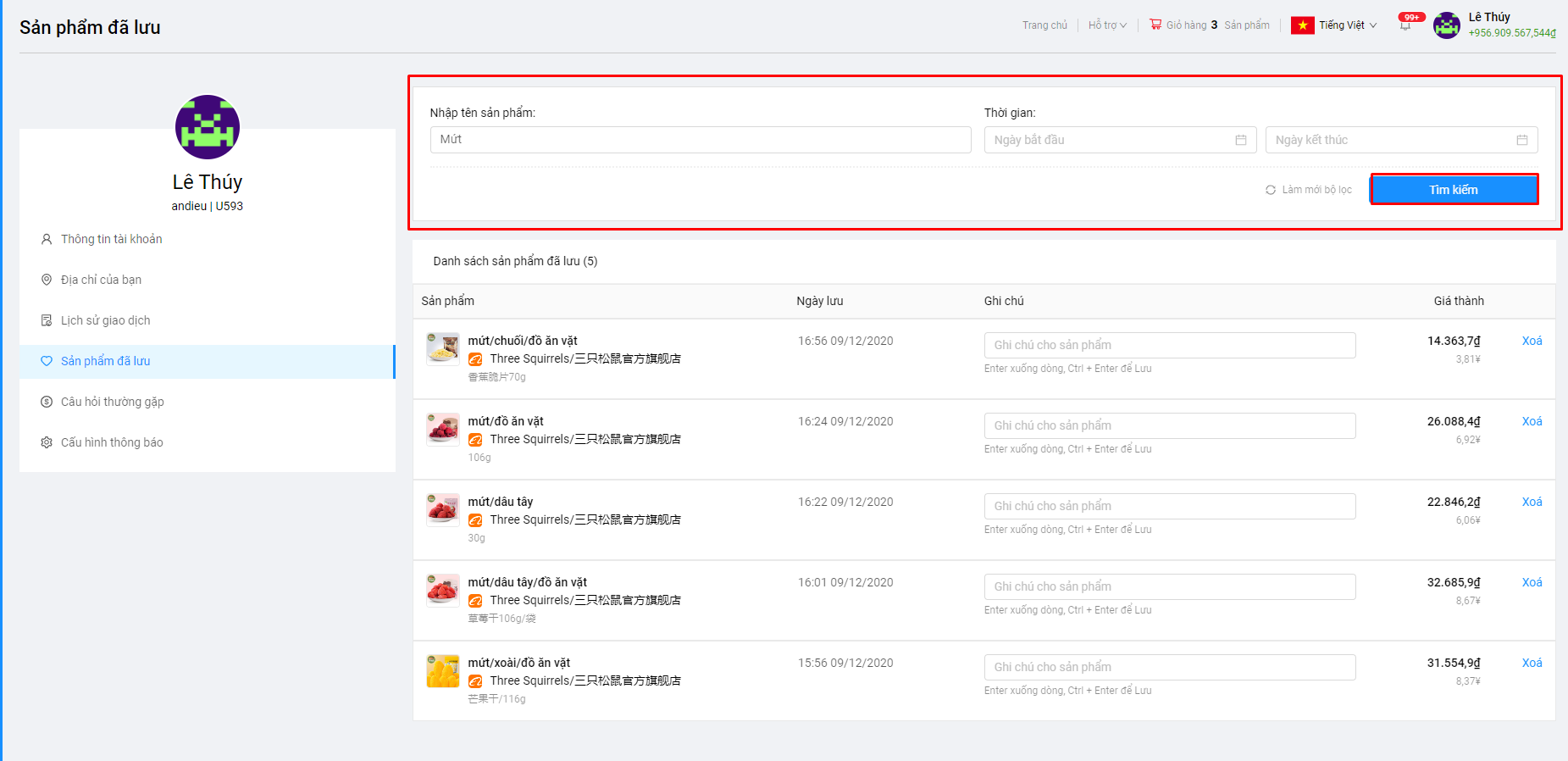 Quý khách có thể lọc theo các điều kiện: Tên sản phẩm, thời gian lưu sản phẩm.