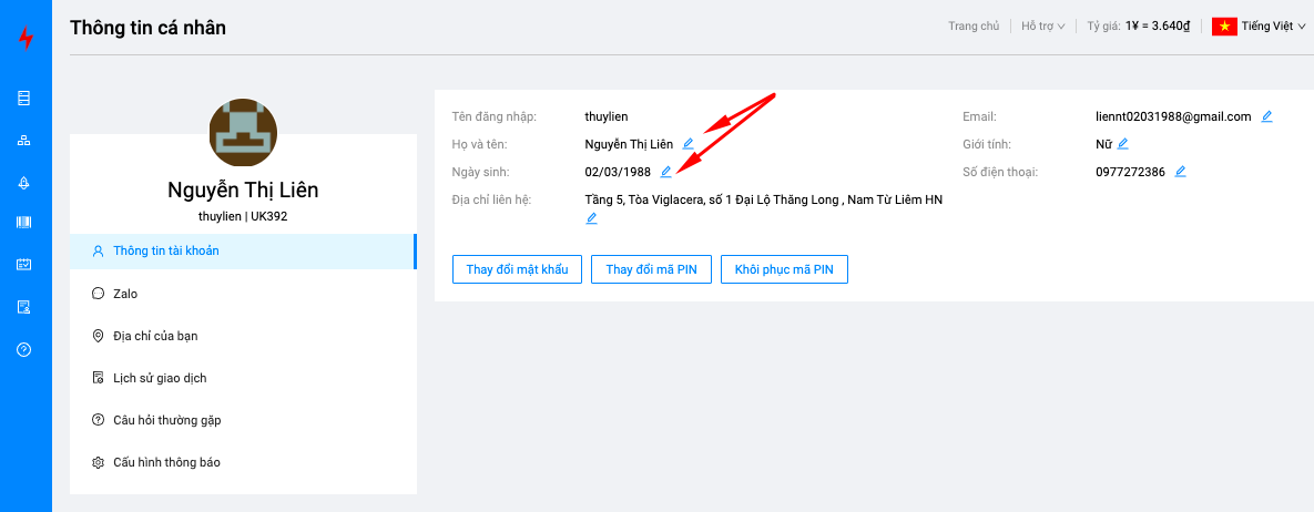 Để thay đổi thông tin cá nhân, Quý khách click vào biểu tượng hình bút bên cạnh thông tin cần sửa đổi như hình: