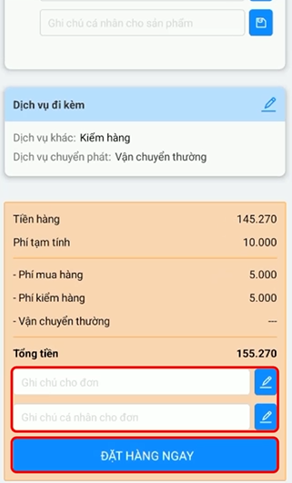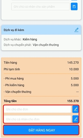 Quý khách kiểm tra chi phí dự kiến đơn hàng, ghi chú thêm và ấn ĐẶT HÀNG NGAY