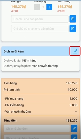 Quý khách kiểm tra số lượng, chọn biểu tượng cây bút để lựa chọn dịch vụ đi kèm