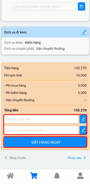 Quý khách kiểm tra chi phí dự kiến đơn hàng, ghi chú thêm và ấn ĐẶT HÀNG NGAY