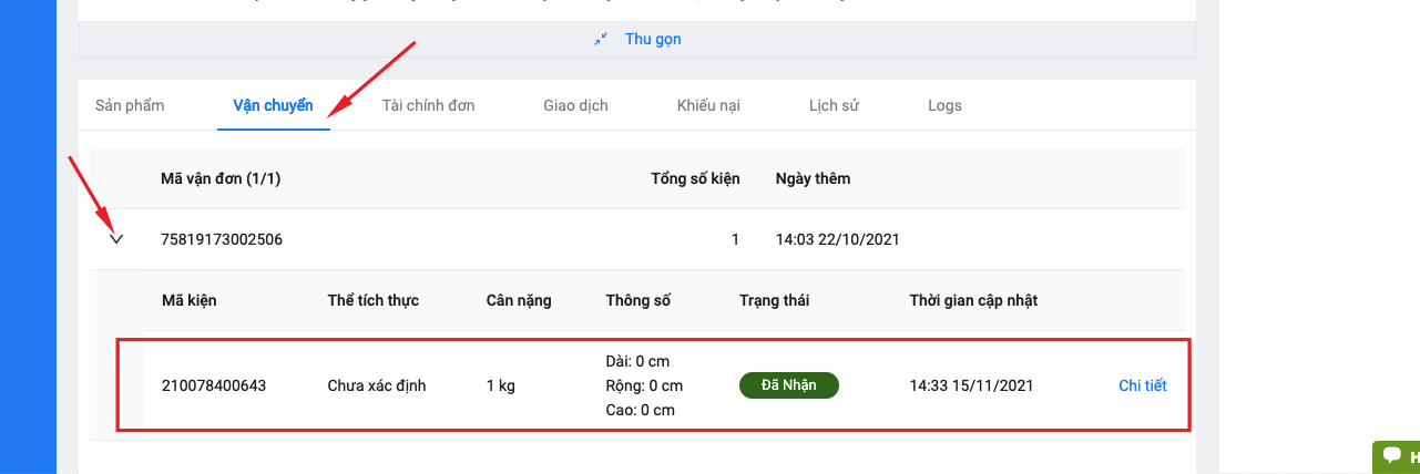 Từ giao diện chi tiết đơn, Quý khách có thể bấm vào các tab thông tin để xem chi tiết, cụ thể: