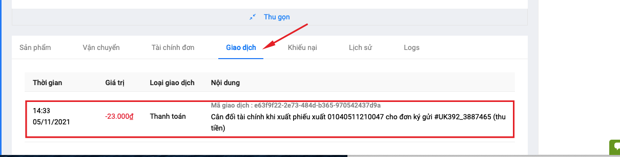 Giao dịch: Toàn bộ thông tin liên quan đến việc thanh toán, truy thu… của đơn hàng