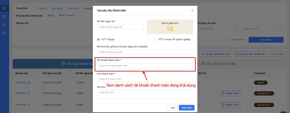 Bước 1: Khách hàng vào hệ thống để xem danh sách tài khoản thanh toán đang khả dụng, chọn YCTT Alipay và chọn 1 tài khoản thanh toán bất kỳ