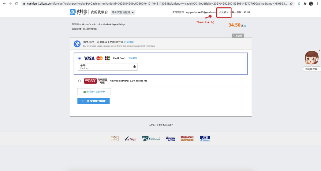 Bước 2: Khách hàng tiến hành mua hàng trên website TMĐT (1688) và chọn thanh toán hộ khi thanh toán cho đơn hàng