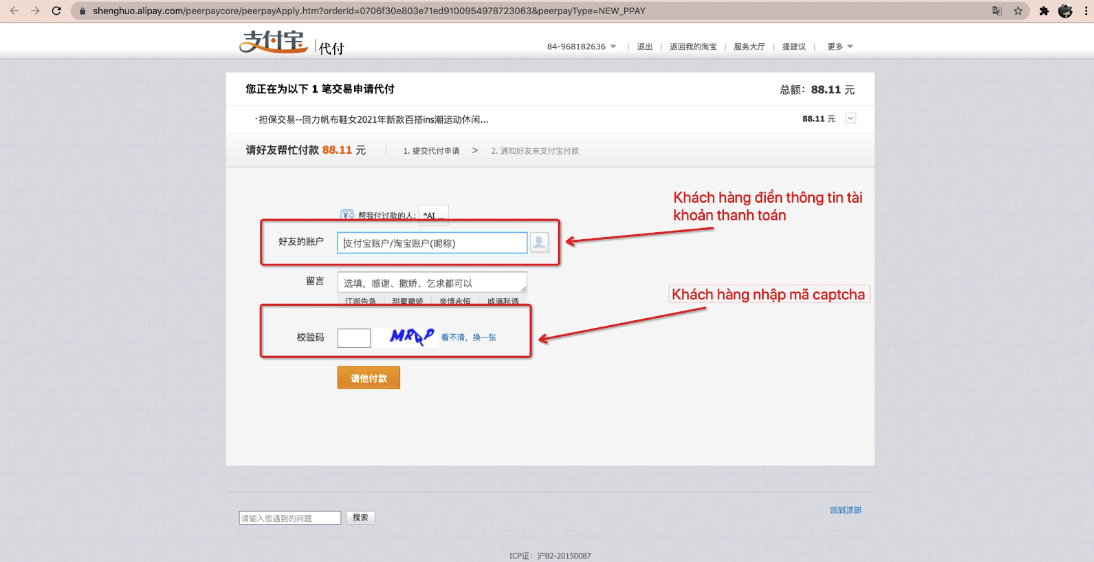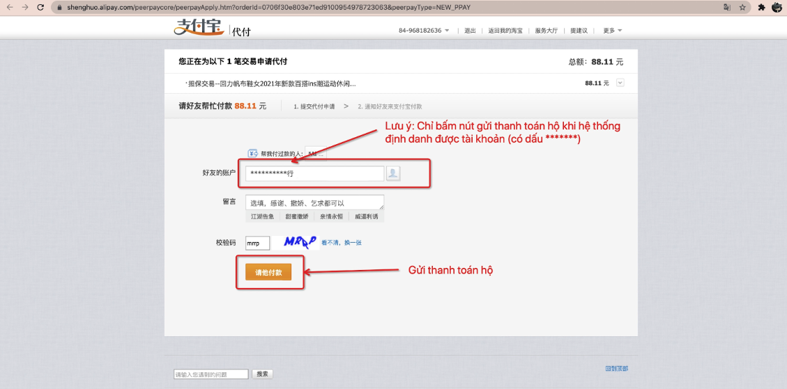 Đối với trường hợp mua hàng trên 1688 Quý khách chọn vào mục thanh toán hộ như hình sau: