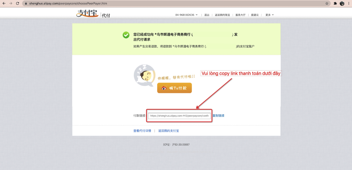 Bước 4: Khi gửi yêu cầu thanh toán hộ thành công, khách hàng vui lòng copy link thanh toán
