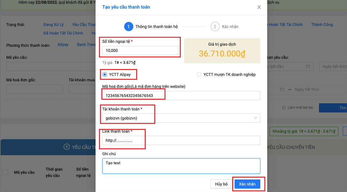 Bước 5: Quay lại giao diện quản lý YCTT để nhập số tiền ngoại tệ của đơn hàng, dán link thanh toán và bấm xác nhận để tạo yêu cầu thanh toán trên hệ thống.
