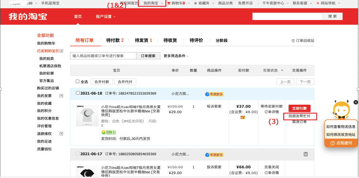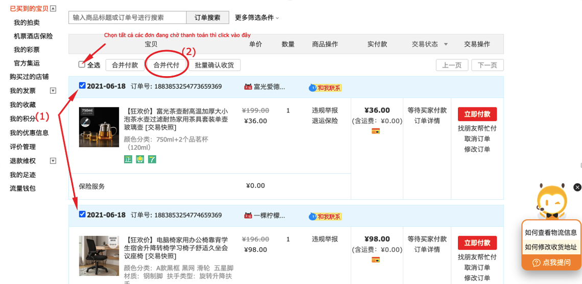 Cách 2: Quý khách quay về trang chủ Taobao/1688/Tmall, chọn Taobao của tôi (1) => Đơn đã mua (2) => Thanh toán hộ (3).