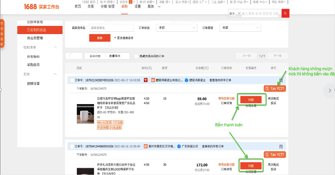 Bước 4: Sau khi khách đặt đơn hàng trên website (Taobao, Tmall, 1688) vui lòng truy cập trang danh sách đơn chờ thanh toán để tạo yêu cầu thanh toán hộ.
