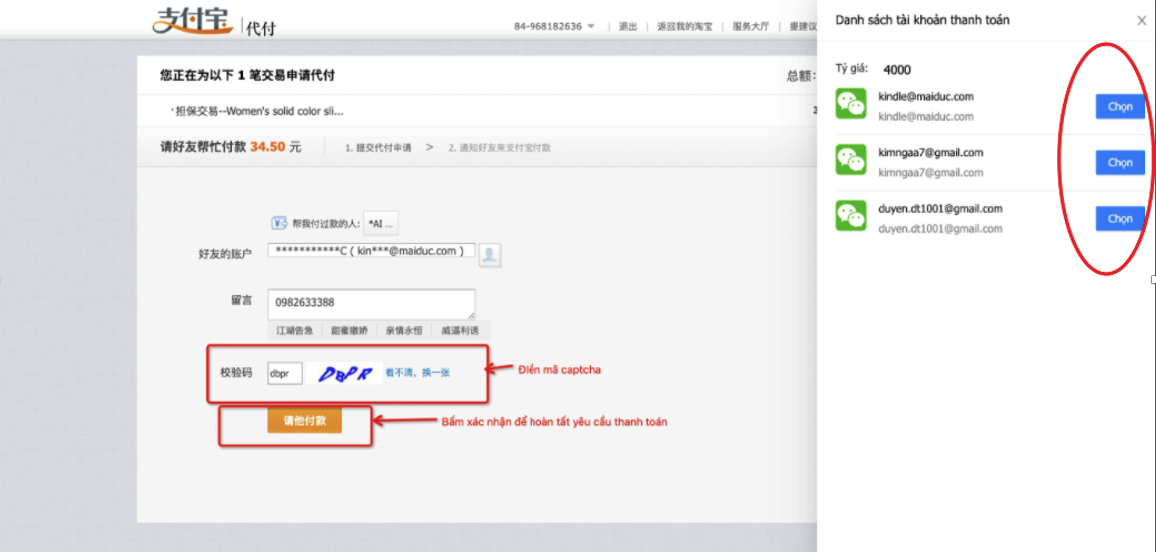 Bước 6: Chọn tài khoản thanh toán cho đơn hàng => Nhập mã Capcha => Chọn xác nhận YCTT hộ như hình
