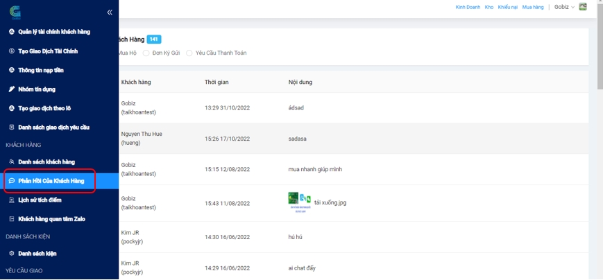 Để vào danh sách phản hồi của khách hàng, từ thanh menu, Quý khách vui lòng chọn Phản hồi của khách hàng