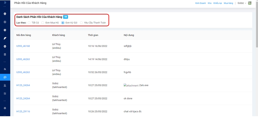 Tại giao diện phản hồi của khách hàng, quý khách có thể chọn lọc theo trạng thái: tất cả, đơn ký gửi, đơn mua hộ, yêu cầu thanh toán để xem được các phản hồi của khách hàng theo từng loại