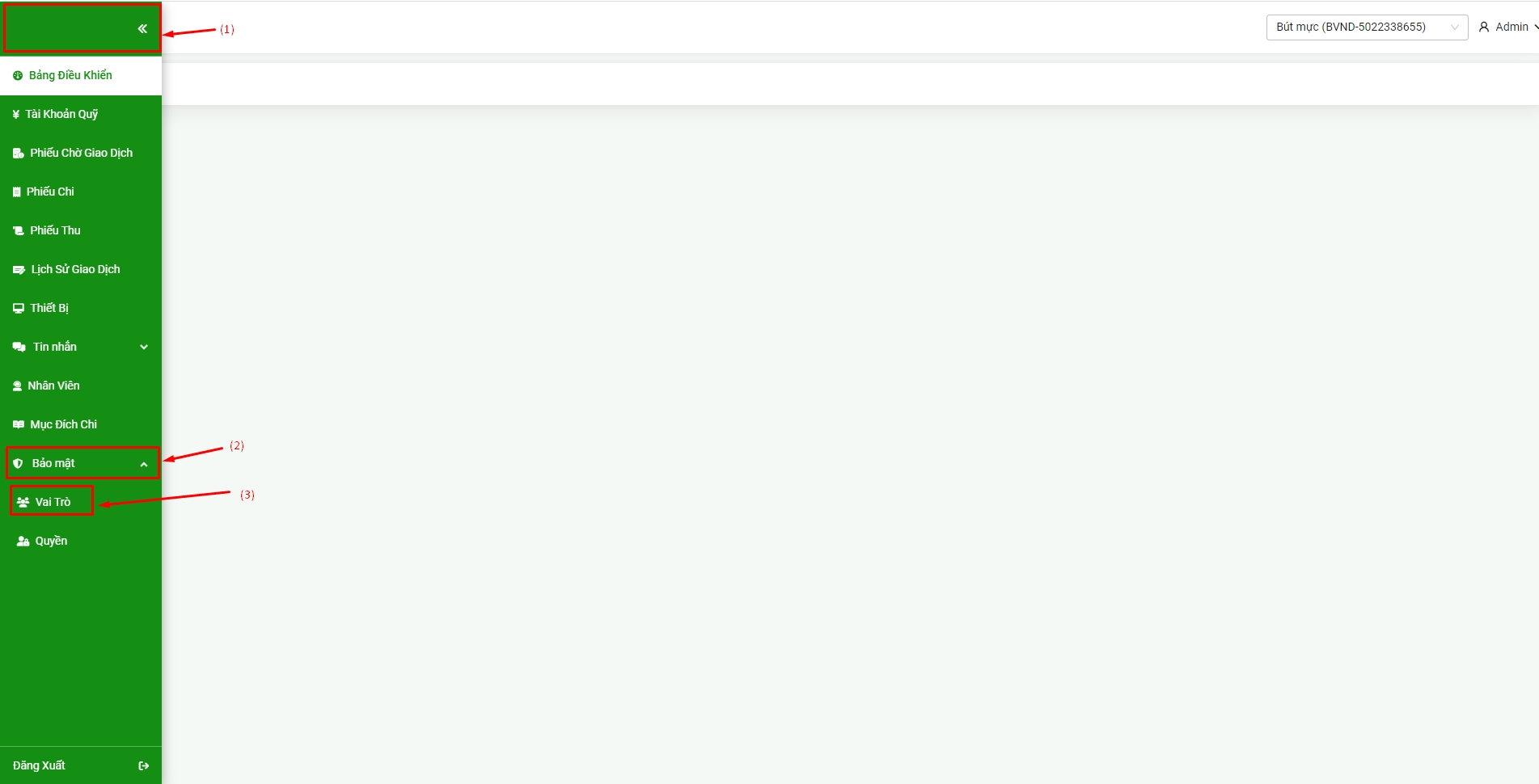 Bước 1: Truy cập menu (1) => bảo mật (2) => vai trò (3) => chọn Tạo vai trò