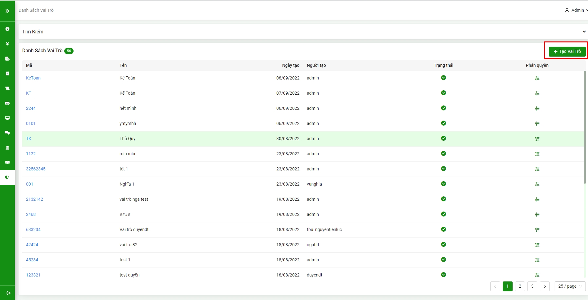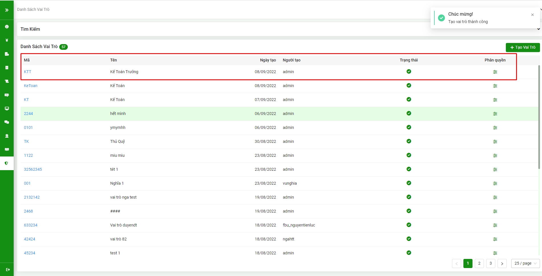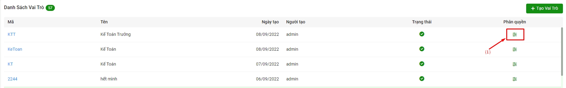 Bước 1: Trong danh sách vai trò, cột phân quyền chọn icon (1)