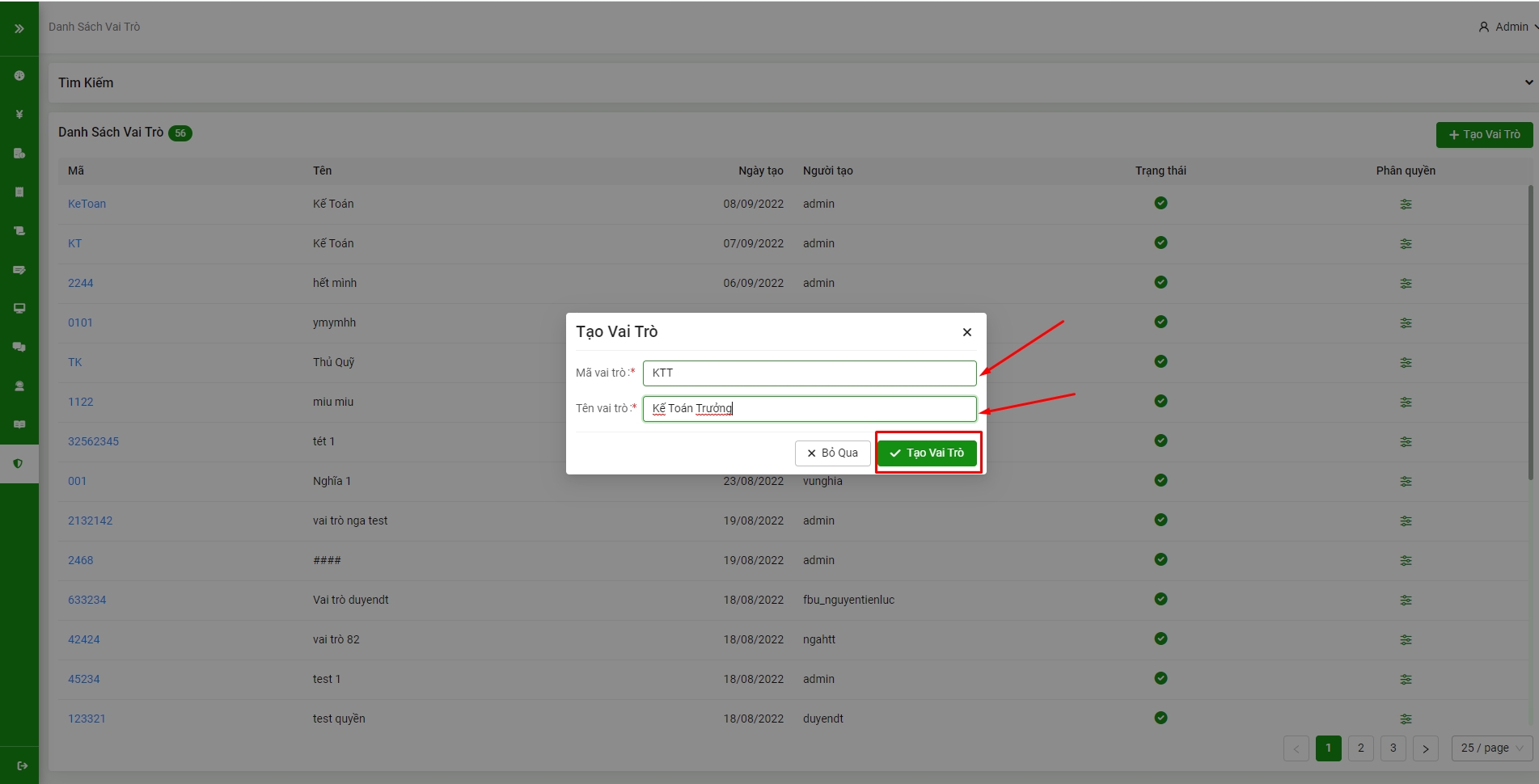 Bước 2: Điền đầy đủ thông tin **Mã vai trò **và Tên vai trò (theo nhu cầu sử dụng của Quý khách) => chọn Tạo vai trò để hoàn tất.